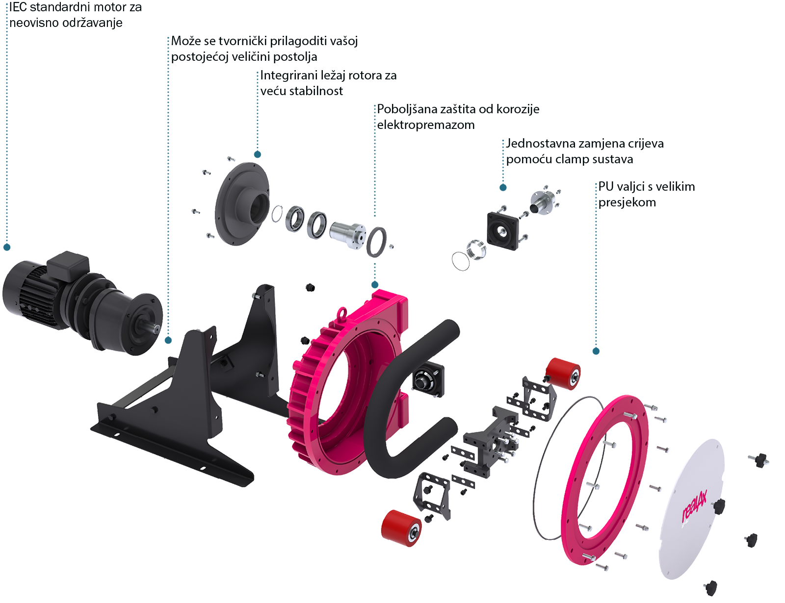 Peristaltičke pumpe s valjcima serije realAx IP za Heavy-Duty primjene opremljene su integriranim ležajevima rotora, velikim PU valjcima za široku raspodjelu tlačnog opterećenja te otpornim crijevima.